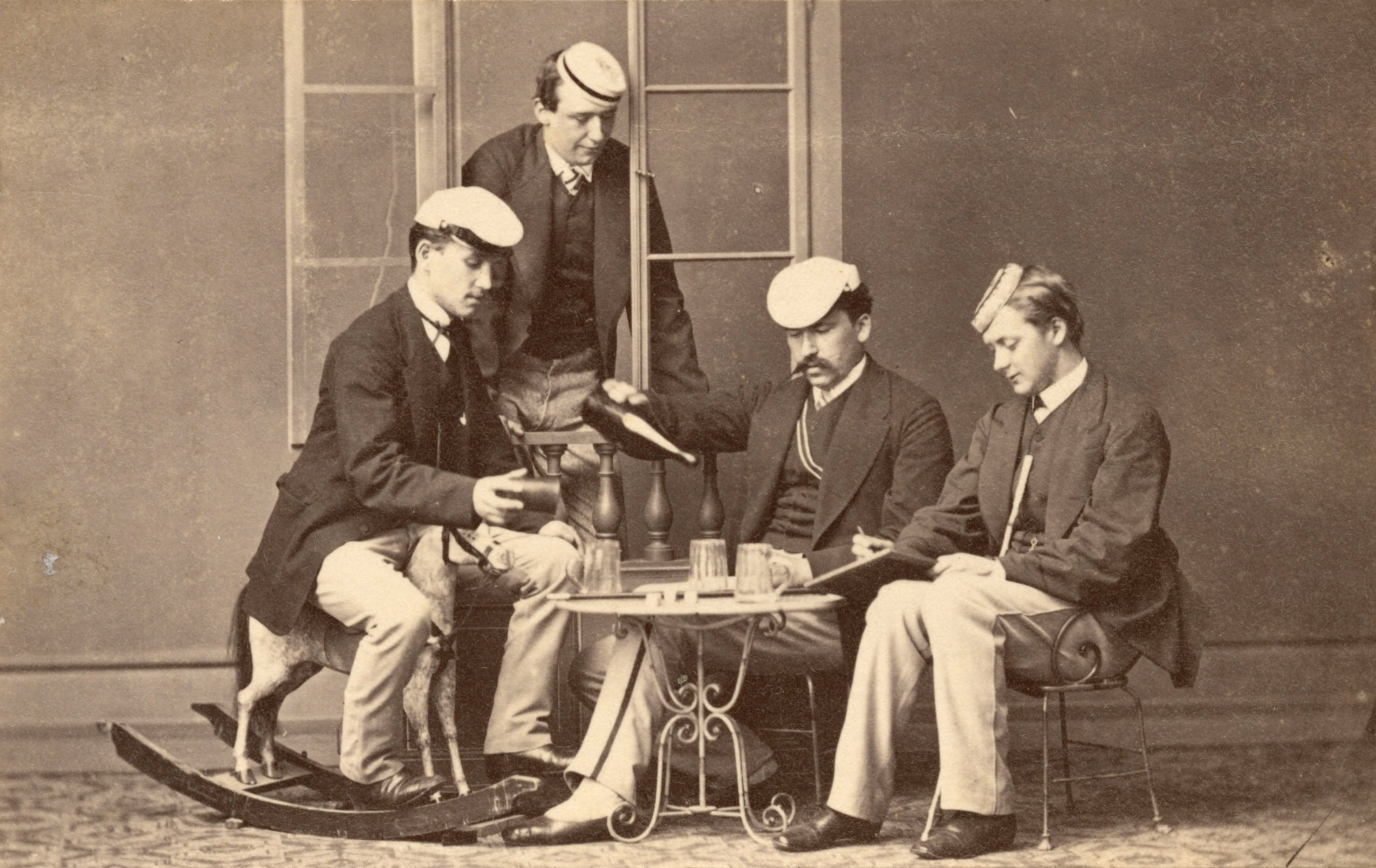 Anonym, Trinkende Männer im Studio, 1860er Jahre, Albuminpapierabzug, 54 x 86 mm, Sammlung Fotostiftung Schweiz