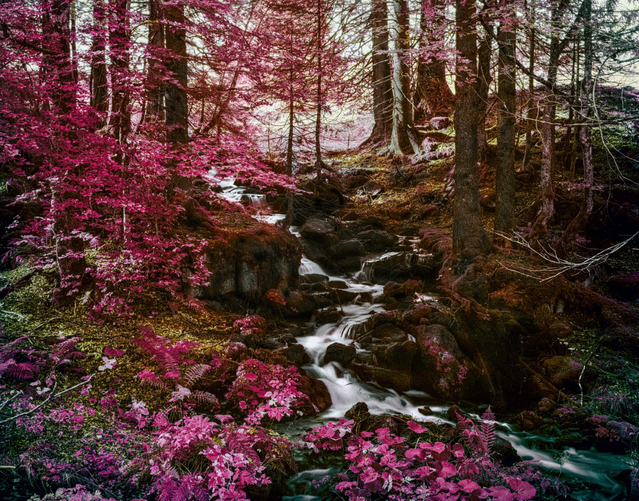 Ueli Alder, Quelle (aus der Serie Field Notes, 2020-), 2020, Aerochrome Infrarot 4x5“ Slide-Film aus dem Jahr 1992, Cross entwickelt in C41 Farbfilm Chemie, © Ueli Alder.