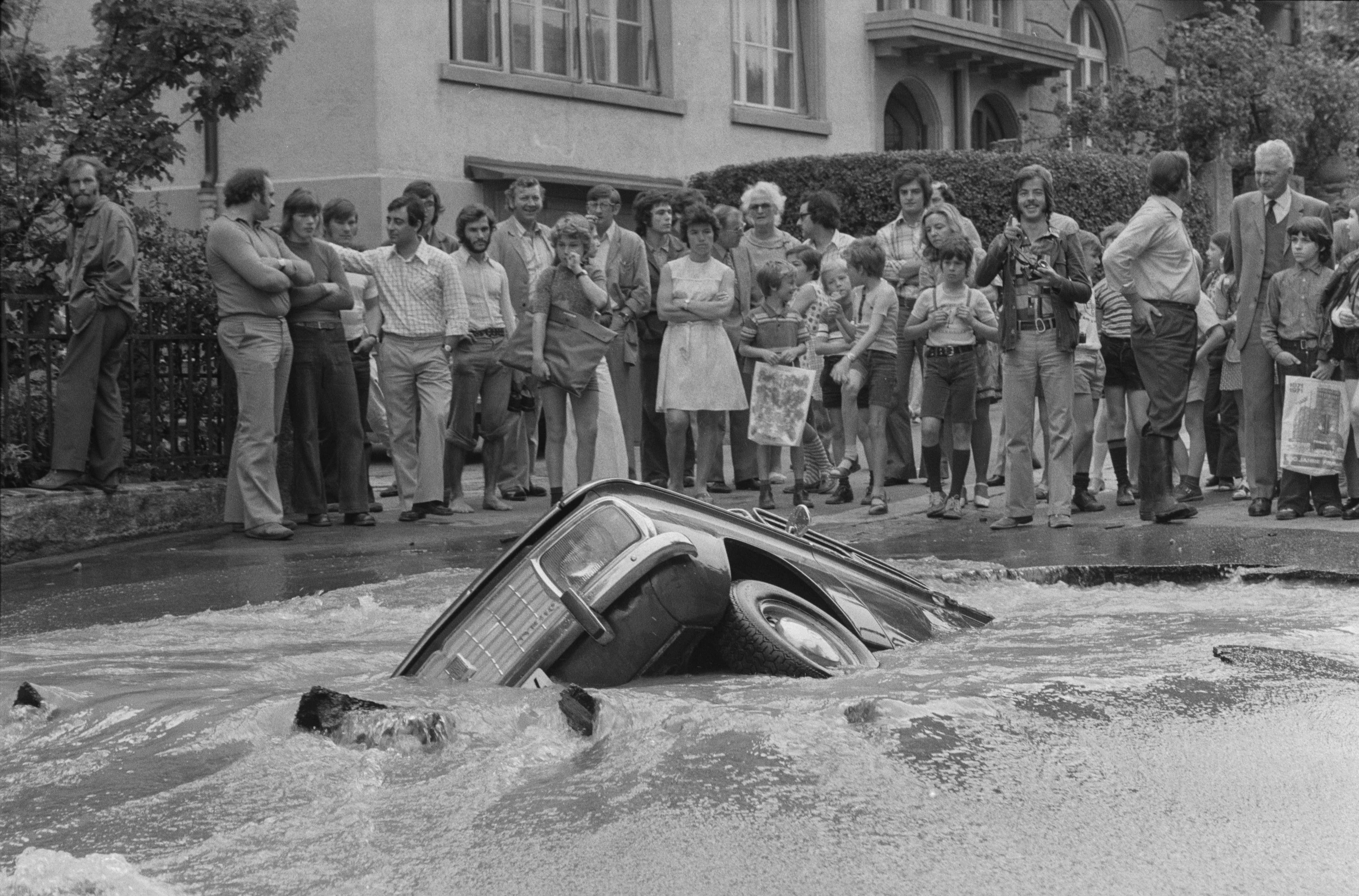 Reportagefotografie eines Wasserleitungsbruchs in Zürich-Oberstrass, ETH-Bibliothek Zürich, 1974, Bildarchiv / Fotograf: Comet Photo AG (Zürich)